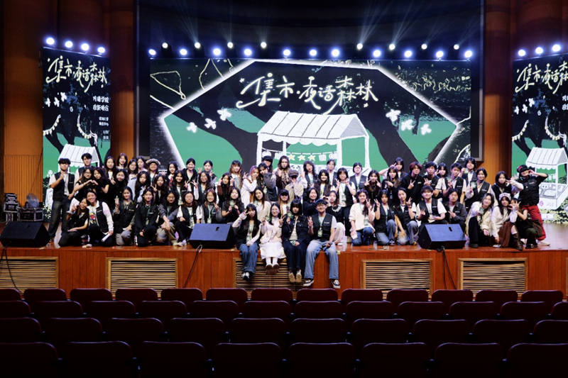 “集市·夜话森林”迎新晚会在演会中心隆重举行。本次晚会以“林间集市,月下开张,只收故事,只付回响”为主题,通过学生自主创排的多个文艺节目,融合艺术表达、思想碰撞与沉浸互动,为1400余名师生、校友、留学生及专程到访的香港学院师生与家长,呈现了一场兼具观赏深度与人文温度的校园文化盛会。